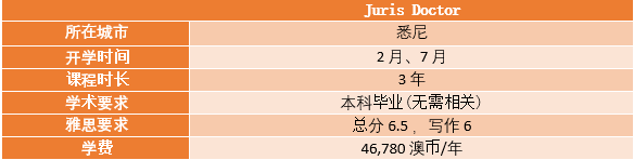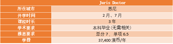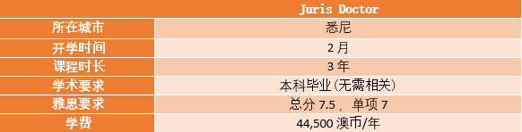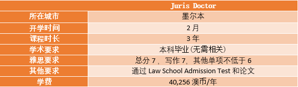 2. Juris Doctor, 简称JD, 法学博士,但实际近似于硕士学位,标准课程长度为3年。JD课程接受没有法律背景的申请人,因此本科任何专业均可申请。除了本科成绩和语言成绩外,一些大学的法学院的JD需要额外的LSAT成绩及论文,如墨尔本大学。读完JD课程后,再完成6个月的律师学院培训即可满足申请成为澳洲注册律师的条件。