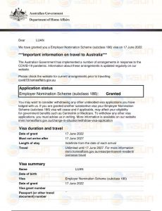 恭喜LI 女士带上配偶,成功拿到186澳洲永居签证!